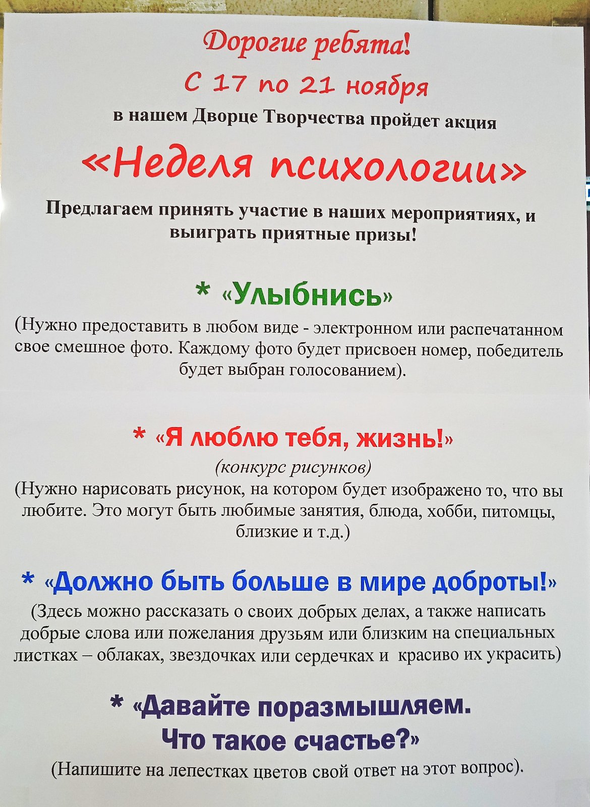 Вниманию воспитанников дворца творчества и их родителей предложены конкурсы и акции, участие в которых позволит лучше узнать самого себя, свои чувства и эмоции, понять причину их возникновения и учиться управлять ими.