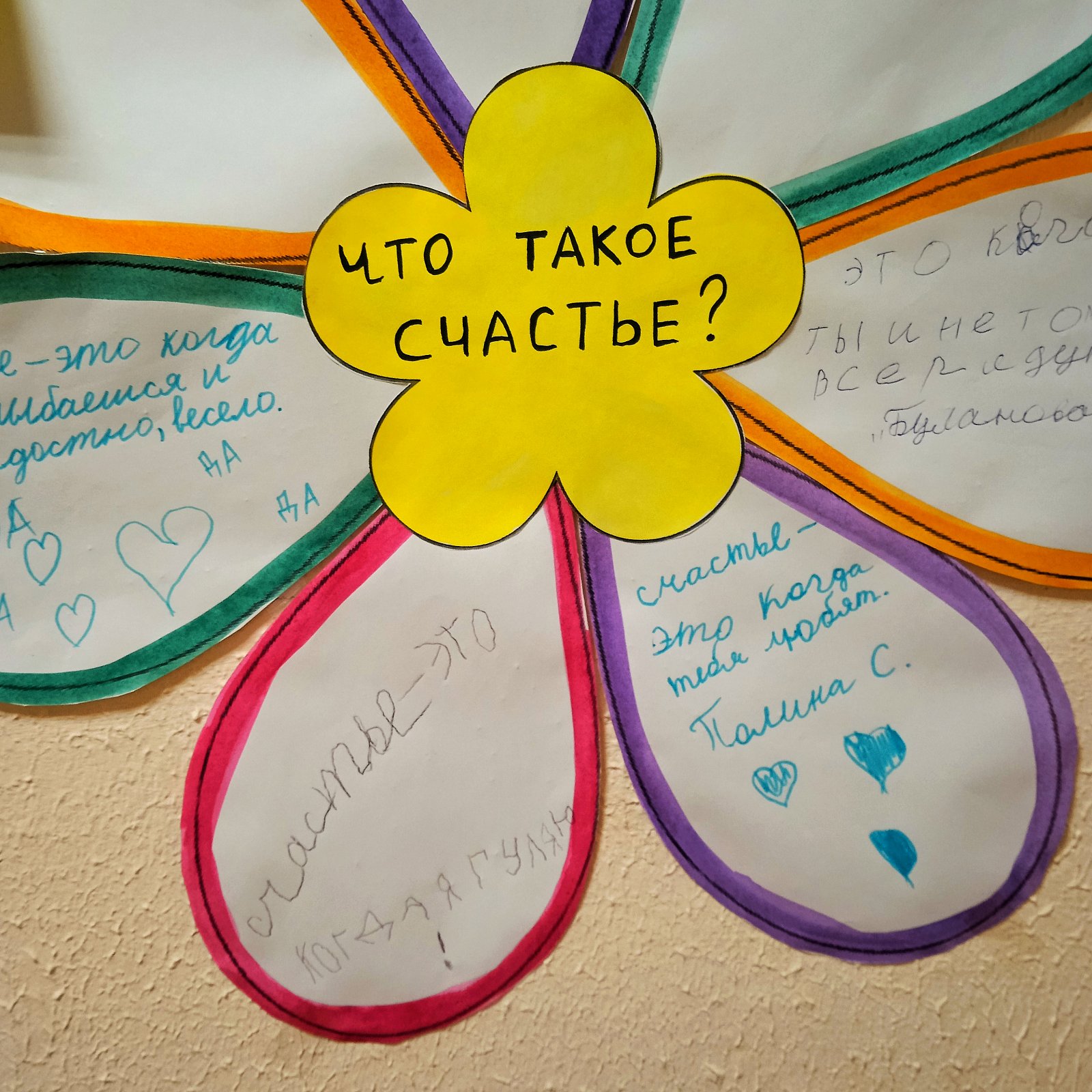 На ярких бумажных цветах ребятам предлагалось поразмышлять над таким важным вопросом, как «Что такое счастье?» Часто может казаться, что у нас чего-то не хватает для того, чтобы быть счастливым. Кажется, что счастье постоянно ускользает, что надо что-то купить, куда-то поехать, что-то получить, и вот тогда…. Но на самом деле не нужно ничего и никого ждать, достаточно внимательно осмотреться. Родные люди рядом, возможность гулять и смотреть на красоту природы, улыбка друзей и близких, каникулы, выходные – это всё маленькие кусочки счастья, из которых и складывается жизнь.