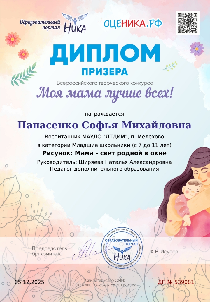 В ноябре месяце участница коллектива "Юный художник" третьего года обучения Панасенко Софья приняла участие во Всероссийском конкурсе "Моя мама лучше всех" и стала призёром в категории младших школьников с 7 до 11 лет.