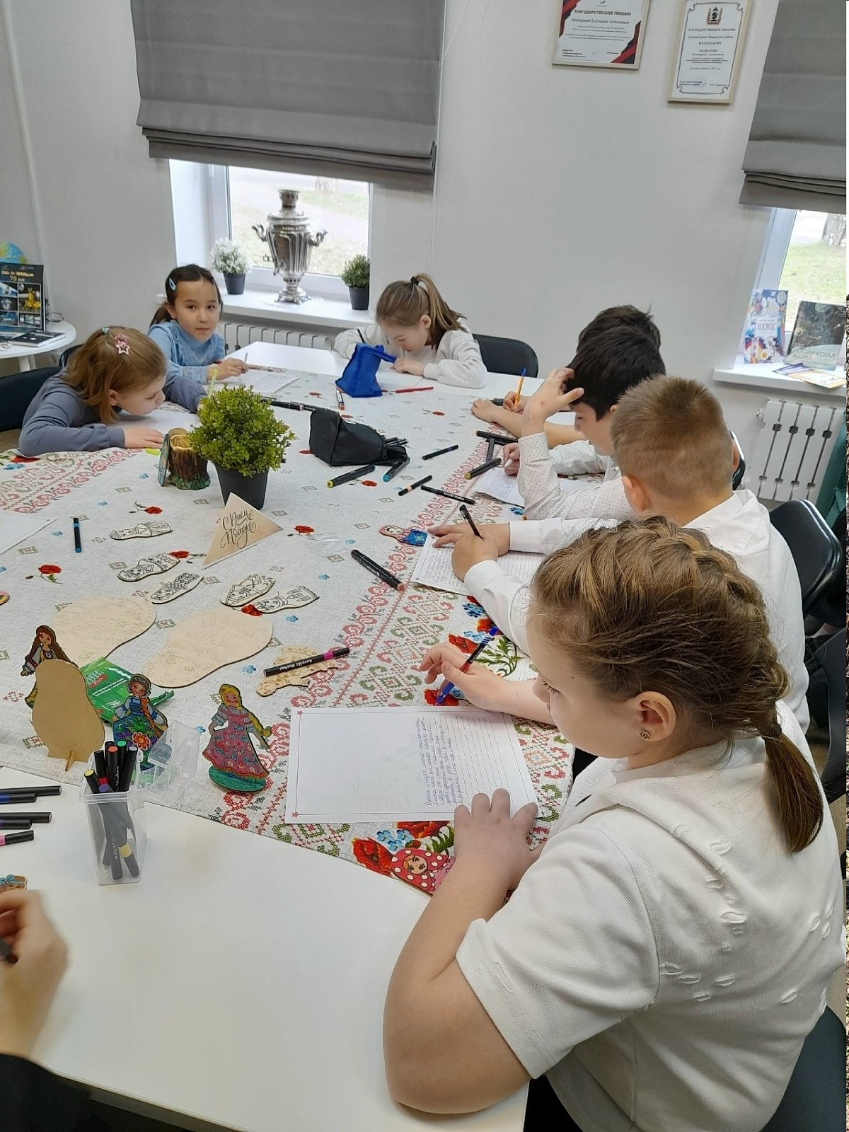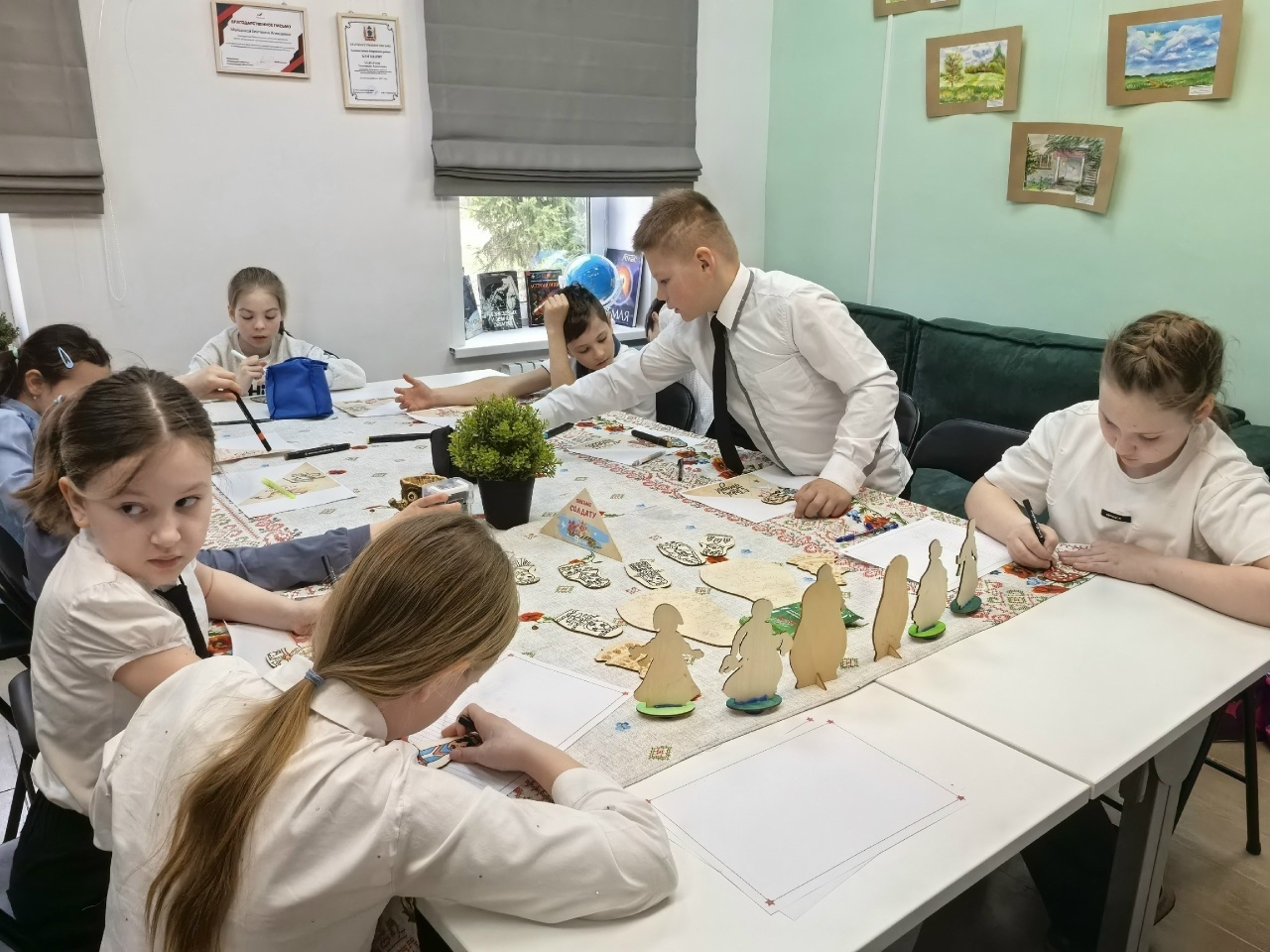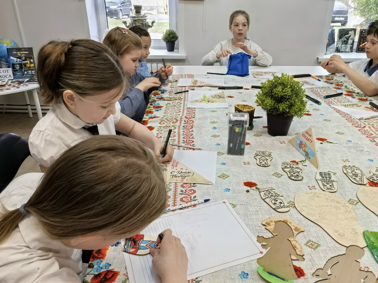 После этого состоялся творческий мастер-класс: ребята расписывали деревянных матрёшек в национальных костюмах народов России. Во время работы в зале звучали легендарные патриотические песни — «Катюша» и «Землянка», создавая особую атмосферу единства и гордости.