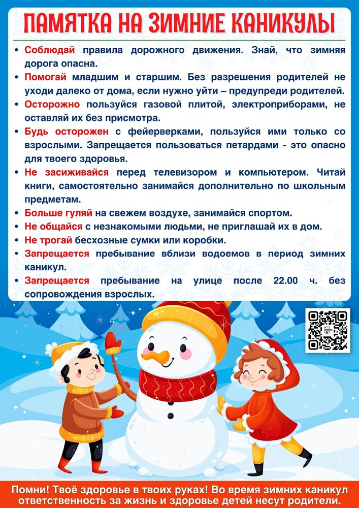 Приближаются новогодние праздники и зимние каникулы. Самое чудесное время для детей: ёлка, подарки, бенгальские огни, хлопушки, петарды, снежные горки, ледянки, санки, лыжи и коньки — все это не только приносит радость, но может огорчить травмами, ушибами, порезами и ожогами. Простые и понятные правила помогут вам и вашим детям сохранить жизнь и здоровье, а также получить от зимних каникул лишь положительные эмоции.